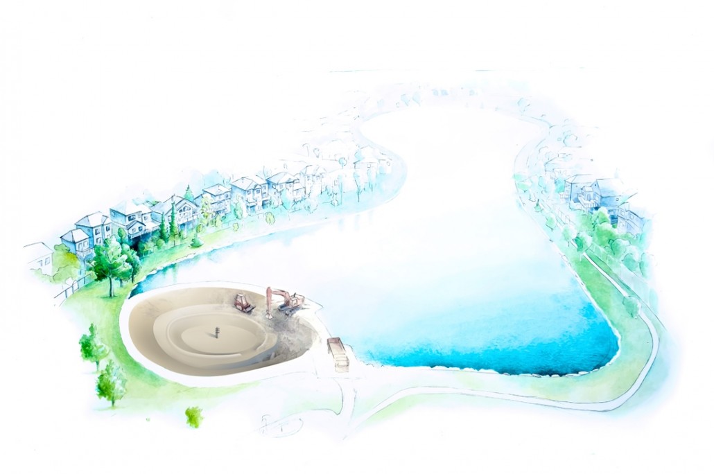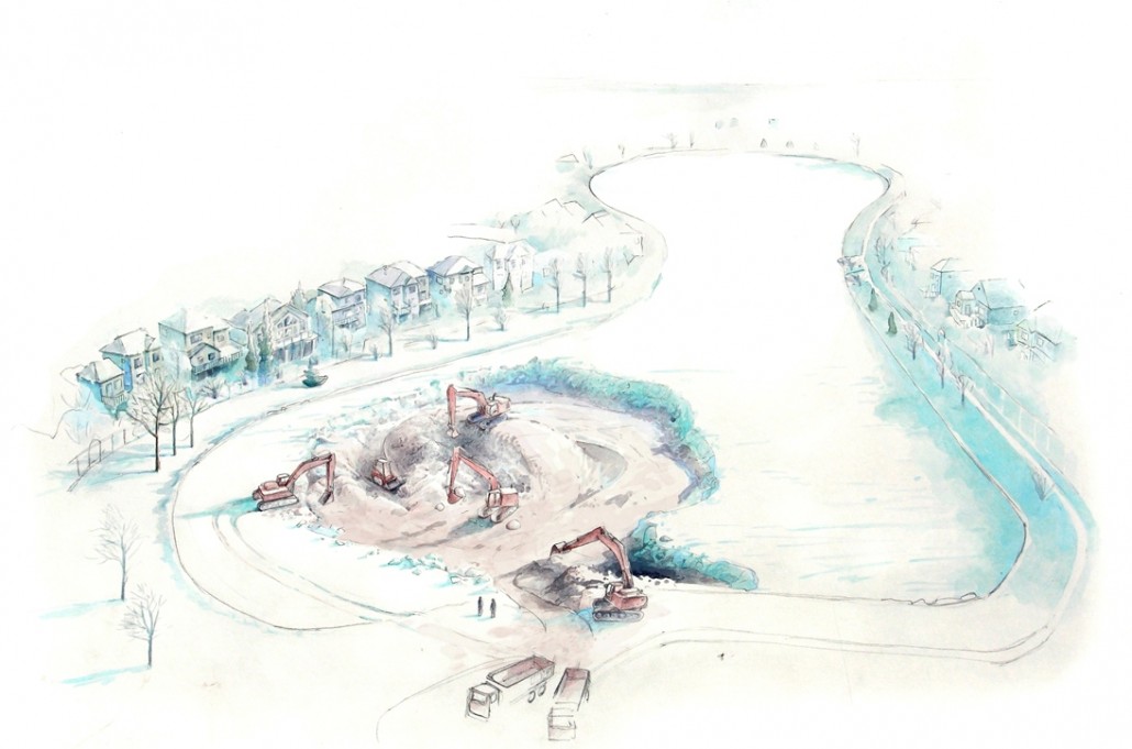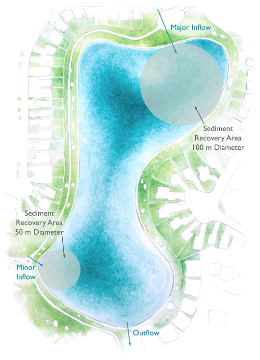 In terms of maintenance and servicing and knowing the cost and technical parameters for the Harvest Hills Pond, S2S has undertaken a servicing exercise specific to a hypothetical Harvest Hills Pond that was designed and constructed according to the multi-cellular design philosophy. Stormwater runoff passing through any Nautilus Pond™ cells would accumulate sediment near the perimeter where it is most accessible for executing a sediment removal operation. Separating each cell with a berm or causeway that supports maintenance vehicle access further simplifies sediment removal using traditional earth moving or specialized sediment removal equipment. The Stretch Dredge, developed by S2S, is an example of highly specialized sediment removal equipment that is well suited to management of slurries and other semi-solid media.