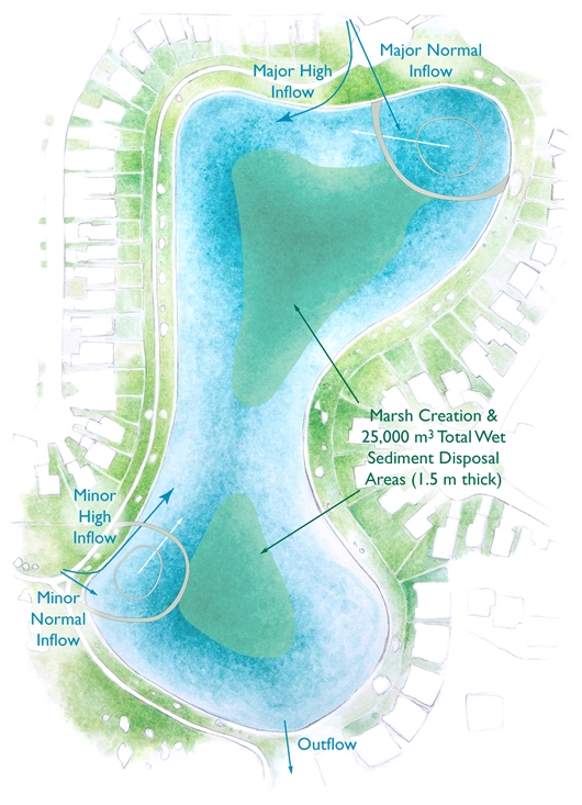 In terms of design, S2S takes inspiration from the many decades of design philosophy development in wastewater treatment plants where the treatment process is discretely partitioned into multiple operating cells. It makes sense to leverage the simplest and most important aspects of this successful design philosophy into stormwater systems by creating independent operating cells (some of which may incorporate Nautilus Pond™ technology) within the footprint of what would otherwise have been a lagoon style pond. One or more of these cells can even be designed as a future space for receiving sediment in a future maintenance operation where sediment accumulated in one part of the pond is relocated. Such a specialized cell could facilitate a multi-year dewatering and bioremediation of nominally contaminated sediment slurry.